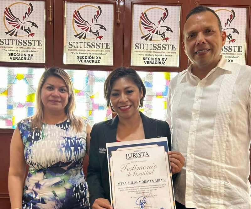 Agradezco sinceramente a la Revista Jurista por otorgarme este Testimonio de Gratitud, en el marco de la conmemoración del Día del Abogado, en mi calidad de Secretaria General del SUTISSSTE Sección XV Veracruz.
